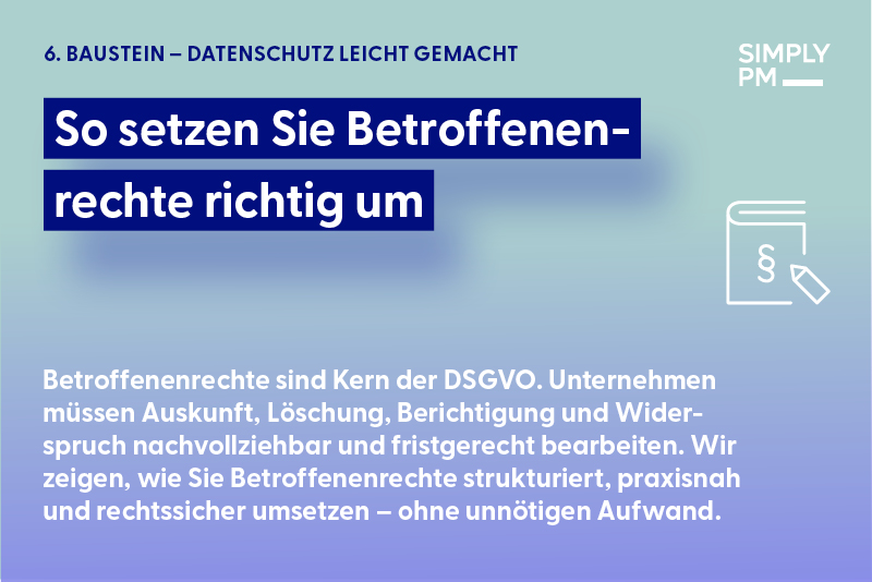 Sie möchten Ihre Prozesse rund um Betroffenenrechte optimieren? SIMPLY PM unterstützt Sie mit Vorlagen, Workshops und praxisnaher Beratung – verständlich, strukturiert und effizient. Jetzt unverbindlich beraten lassen.